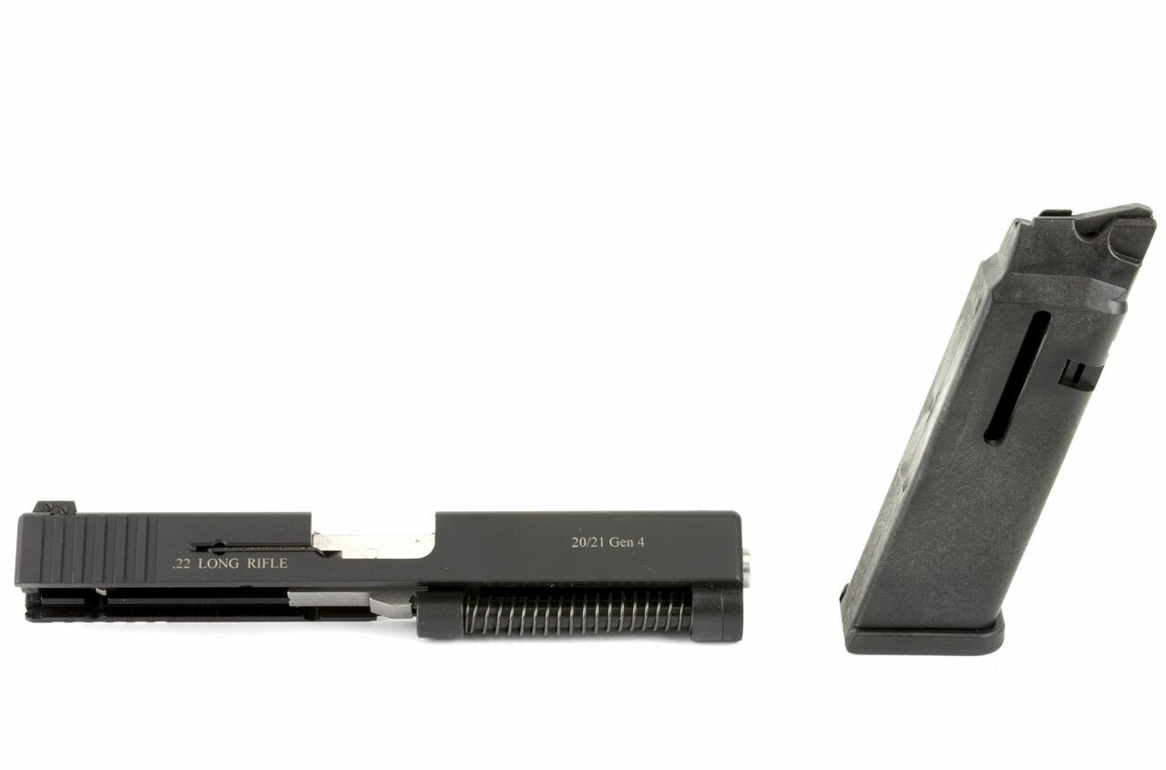 The Advantage Arms 22LR Conversion kits provide you with the ability to shoot for a fraction of the cost in a few seconds, if you can field strip your Glock, you can easily add & remove your Advantage Arms kit. The Advantage Arms Glock LE kits feature removable Glock OEM sights, which are adjustable. The LE Advantage Arms kits also feature the following: β’Range Bag β’CNC Machined 7075-T6 Aluminum Slide. 7075-T6 Aluminum is the strongest of the aluminum alloys and is used throughout the aerospace industry. β’416 Heat Treated Stainless Steel .22LR barrel. β’Recoil Spring and Guide Rod. β’One Polymer 10 Round Magazine. β’Starter Cleaning Kit which includes a cleaning rod, brush, patches, and our AAGL-22 oil. β’One Year Factory Direct Warranty against defect in Material or Workmanship. This conversion kit fits the G20 and G21 models. This is for generation 4 Glock models G20 and G21